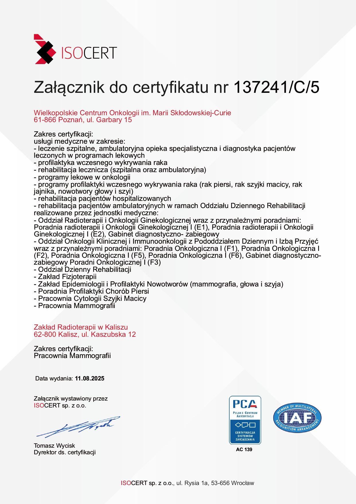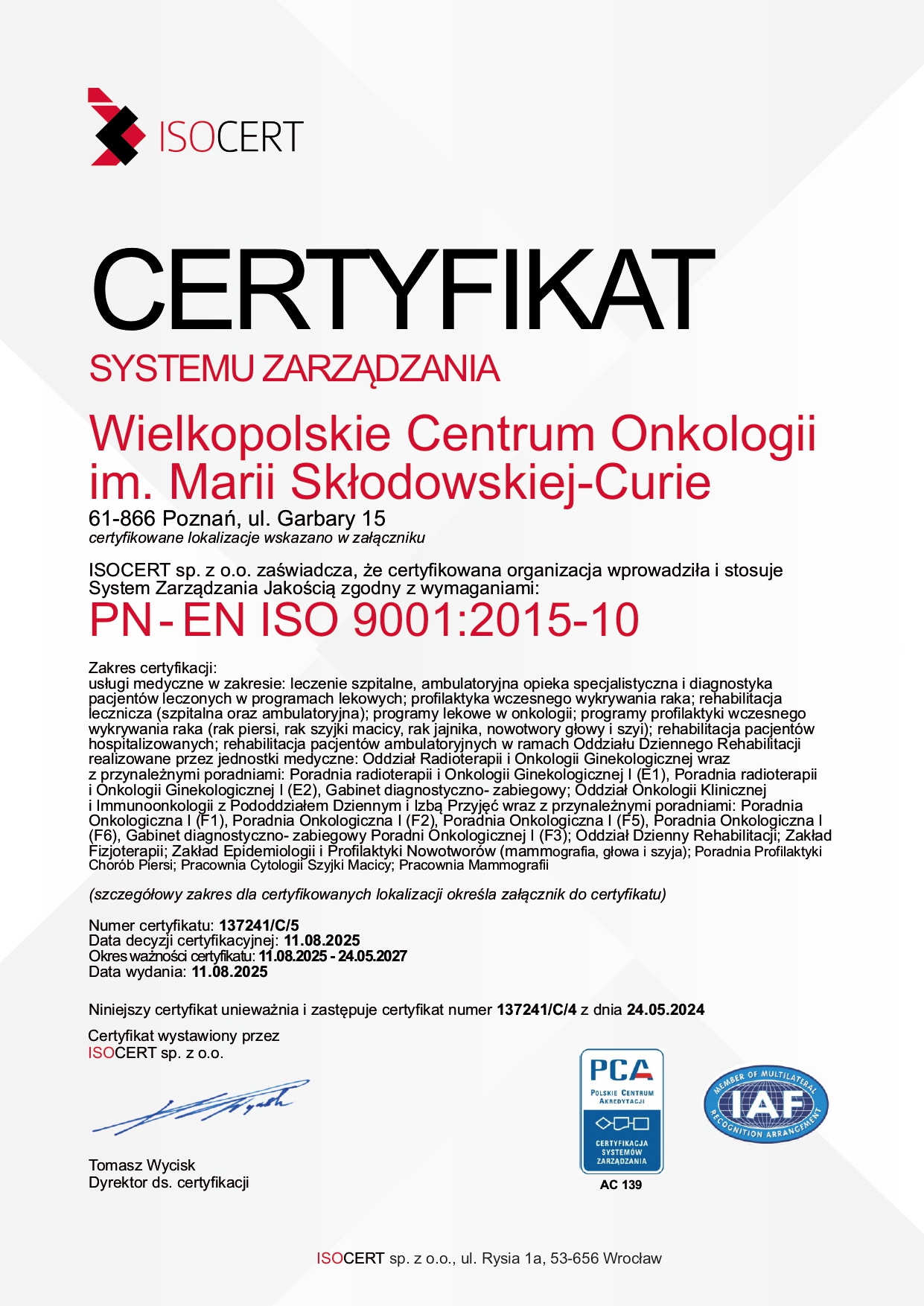 Wielkopolskie Centrum Onkologii od roku 2017 posiada Certyfikat Akredytacyjny potwierdzający spełnienie standardów akredytacyjnych dla leczenia szpitalnego.