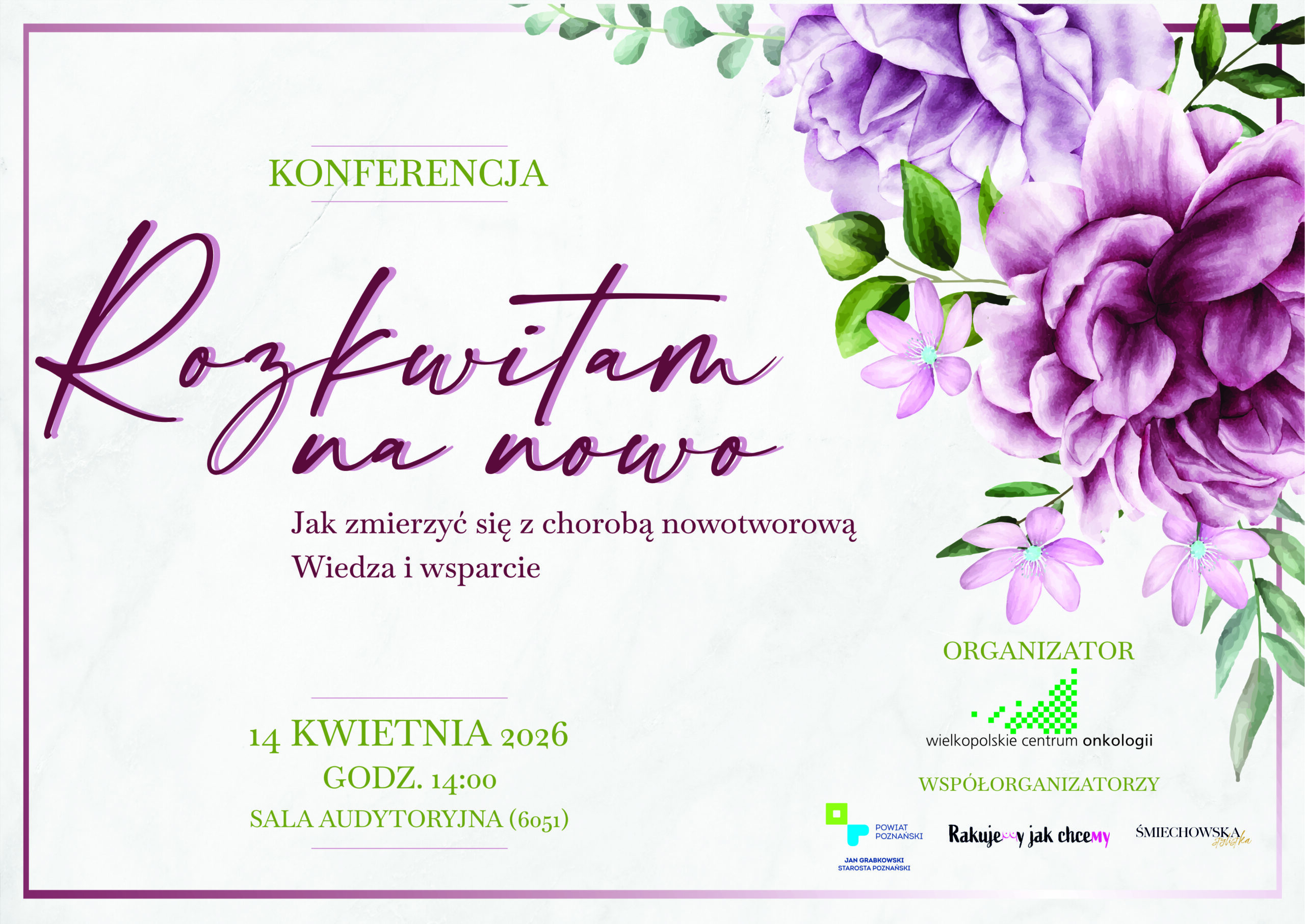 Szanowni Państwo, Serdecznie zapraszamy do uczestnictwa w wydarzeniu pod nazwą „Rozkwitam na nowo – jak zmierzyć się z chorobą nowotworową - wiedza i wsparcie.” organizowanego przez Wielkopolskie Centrum Onkologii, przy...