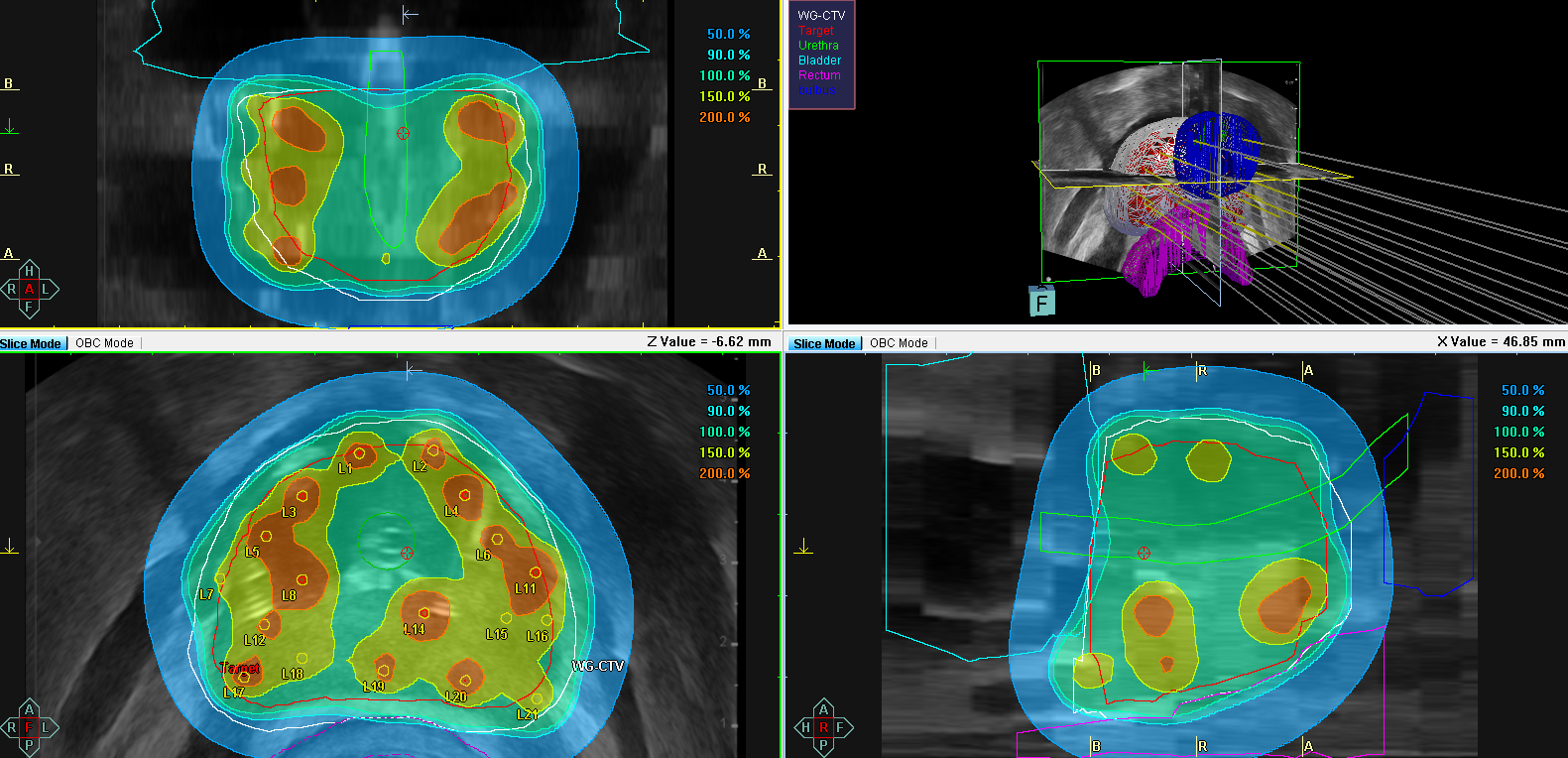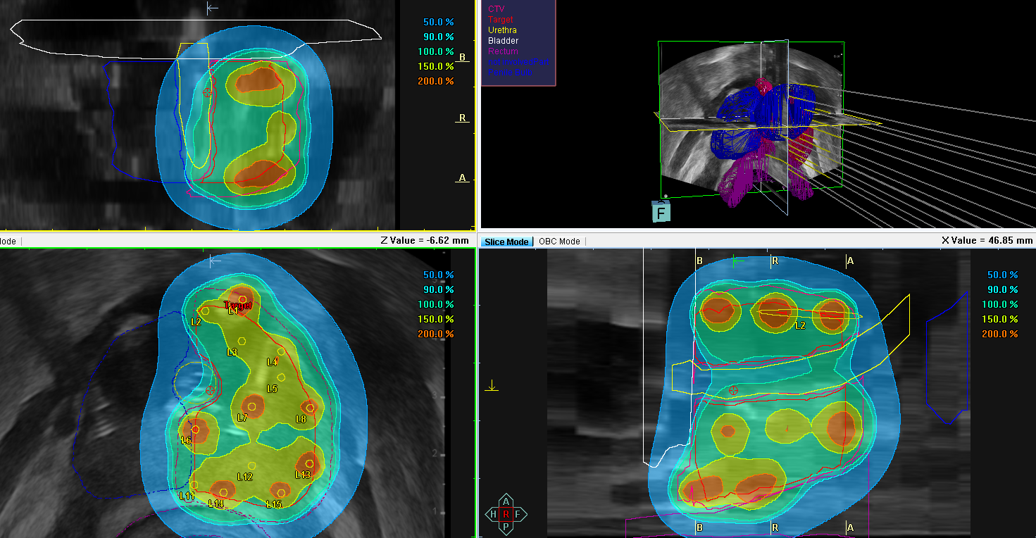 Na terenie Zakładu Brachyterapii WCO prowadzimy badanie kliniczne POWER (z ang. Partial Or Whole gland for ERections) dla osób aktywnych seksualnie z rakiem prostaty w grupie niskiego i pośredniego ryzyka. Jest to międzynarodowe badanie wieloośrodkowe prowadzone przez Uniwersytet w Amsterdamie, a głównym badaczem jest były prezydent GEC-ESTRO Bradley Peters. Badanie ma na celu ocenę zachowania potencji i możliwości współżycia seksualnego u chorych z rakiem prostaty podanych brachyterapii. W trakcie randomizacji pacjenci będą kwalifikowani do leczenia całego gruczołu (grupa kontrolna, Rys. 1) lub leczenia połowy gruczołu krokowego (grupa badana, Rys. 2).