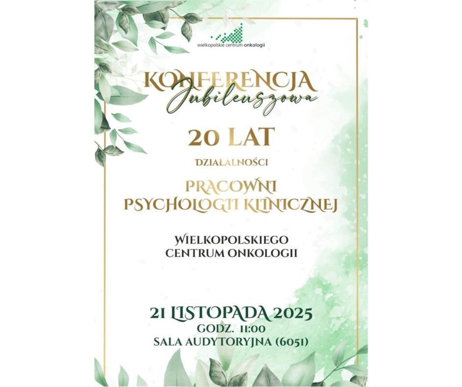 Szanowni Państwo, Koleżanki i koledzy,serdecznie zapraszamy do uczestnictwa w organizowanej przez Wielkopolskie Centrum Onkologii "Konferencji Jubileuszowej 20-lecie działalności Pracowni Psychologii Klinicznej Wielkopolskiego Centrum Onkologii", która odbędzie się 21 listopada 2025 r. w Wielkopolskim Centrum Onkologii (sala audytoryjna 6051).