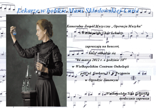 Serdecznie zapraszamy Państwa na koncert \"Lekarze w hołdzie Marii Skłodowskiej -Curie\", który odbędzie się w dniu 4 marca o godzinie 18.30 w Ogrodzie Zimowym. Organizatorem koncertu jest Wielkopolska Izba Lekarska a wystąpią przed Państwem: Kameralny Zespół Muzyczny \"Operacja Muzyka\" oraz Wielkopolski Chór Lekarzy.