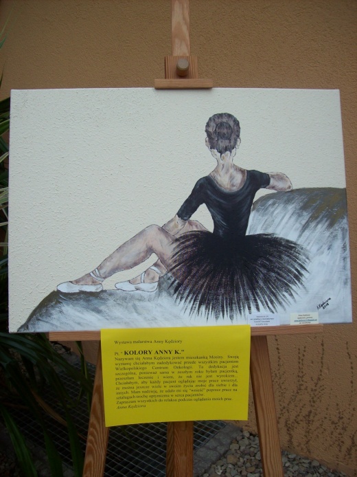 Nazywam się Anna Kędziora jestem mieszkanką Mosiny. Swoją wystawę chciałabym zadedykować przede wszystkim pacjentom Wielkopolskiego Centrum Onkologii. Ta dedykacja jest szczególna, ponieważ sama w zeszłym roku byłam pacjentką, przeszłam leczenie i wiem, że rak nie jest wyrokiem...Chciałabym, aby każdy pacjent oglądając moje prace uwierzył, że można jeszcze wiele w swoim życiu zrobić dla siebie i dla innych. Mam nadzieję, że udało mi się \"wnieść\" poprzez prace na sztalugach trochę optymizmu w serca pacjentów.