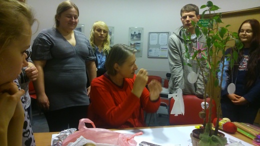 W dniu dzisiejszym gościliśmy panie Joannę Zwoleńską i Annę Kozłowską-Agacińską, które prowadziły warsztaty arteterapeutyczne. Podczas spotkania rysowaliśmy prace dotyczące naszych marzeń oraz uczyliśmy się, jak wykonać ozdoby ze słomek, papieru i opłatka.