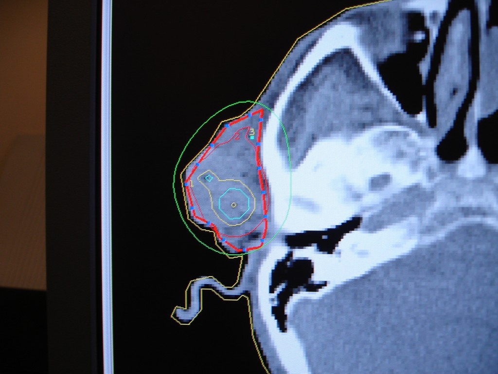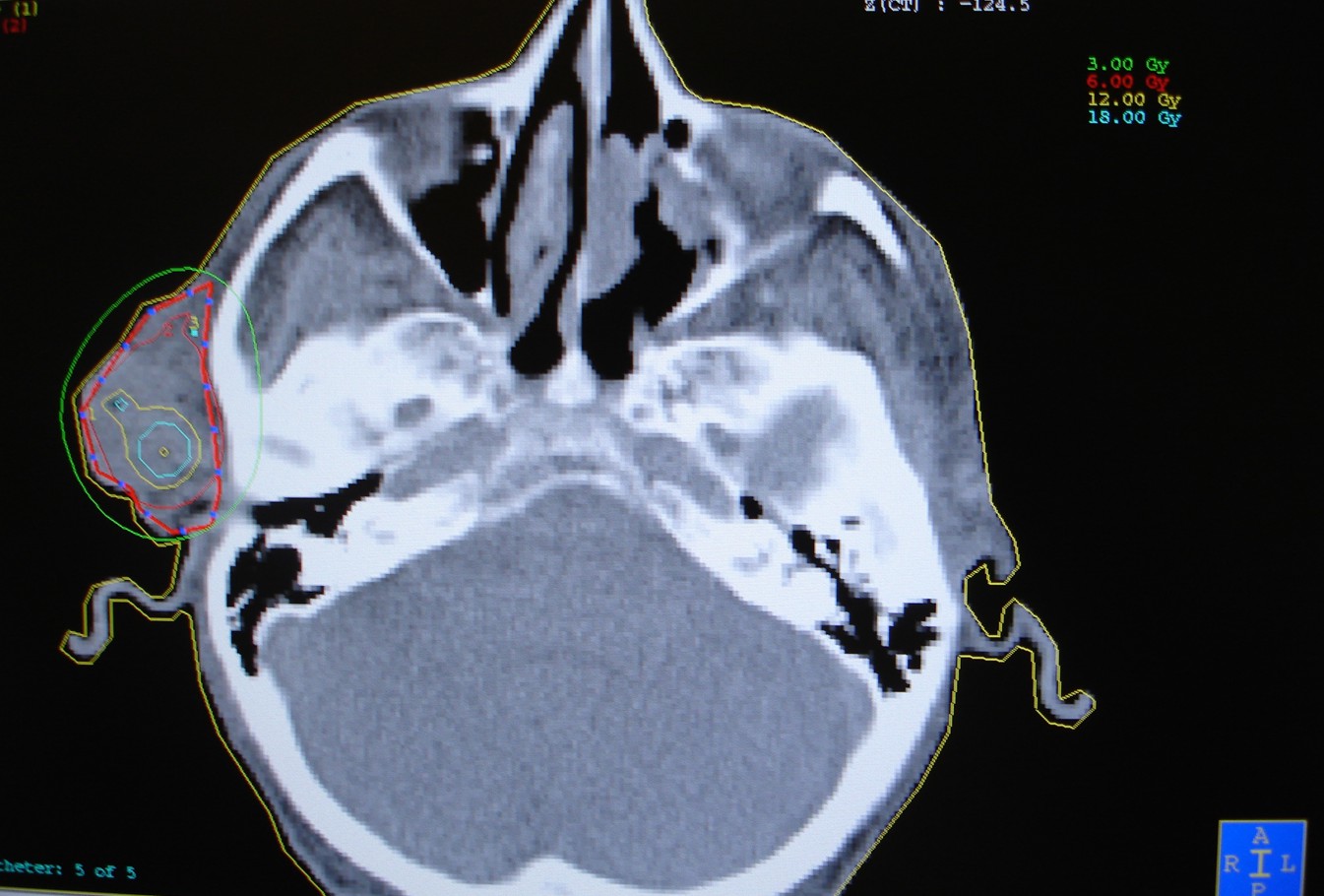 Planowanie leczenia - skan TK, wrysowany CTV (Clinical Target Volume), widok izodoz